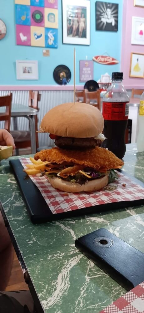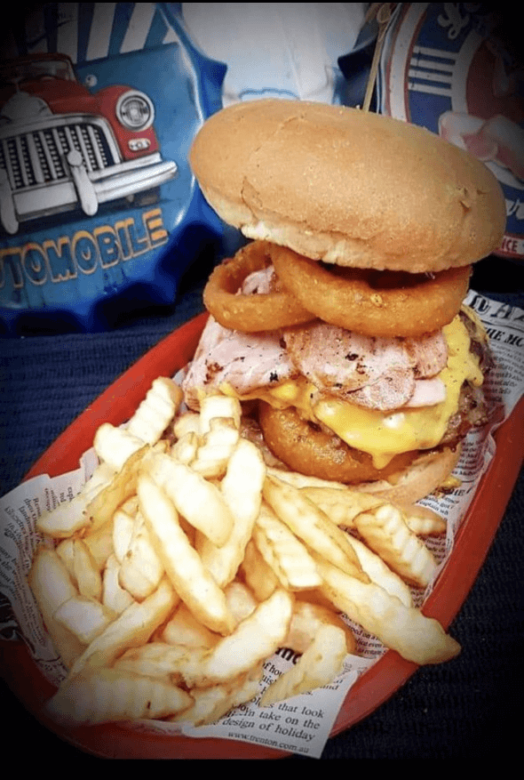Beef Patty, Chicken Schnitzel, lettuce, tomato, saucy coleslaw, bacon, egg, pineapple, crispy onion rings, cheese & sauce
