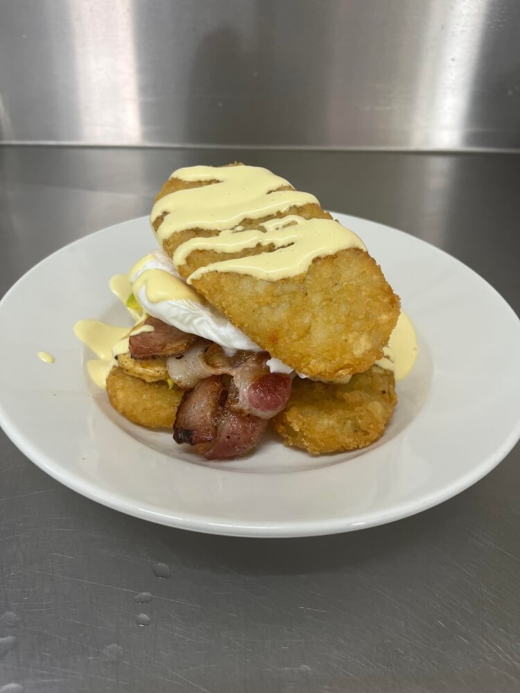 Meat patty, sausage patty, bacon, egg, mushrooms, cheese and hollandaise sauce with a side hashbrown