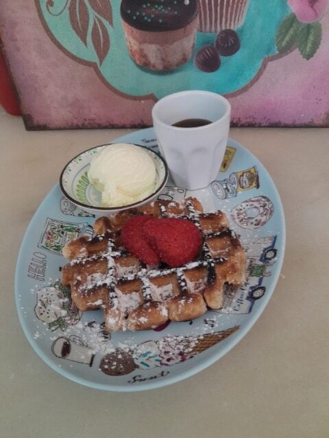 French Toast or Waffles, bacon rashers, sausages, eggs (your choice), fresh banana, ice cream & maple syrup