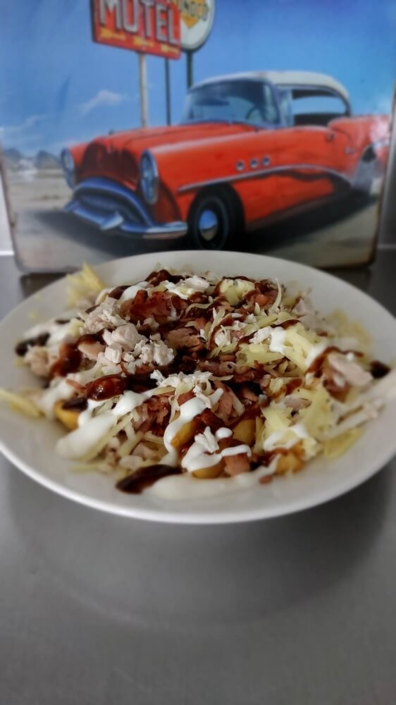 Fries loaded with shredded chicken, crispy bacon pieces, grated cheese drizzled with BBQ & Mayo