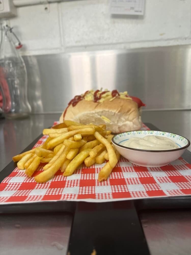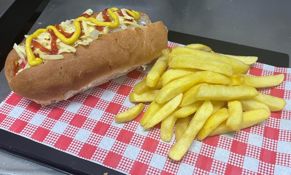 Frankfurt, crispy bacon, grated cheese, crispy onion rings drizzled with hot chilli sauce & creamy mayo