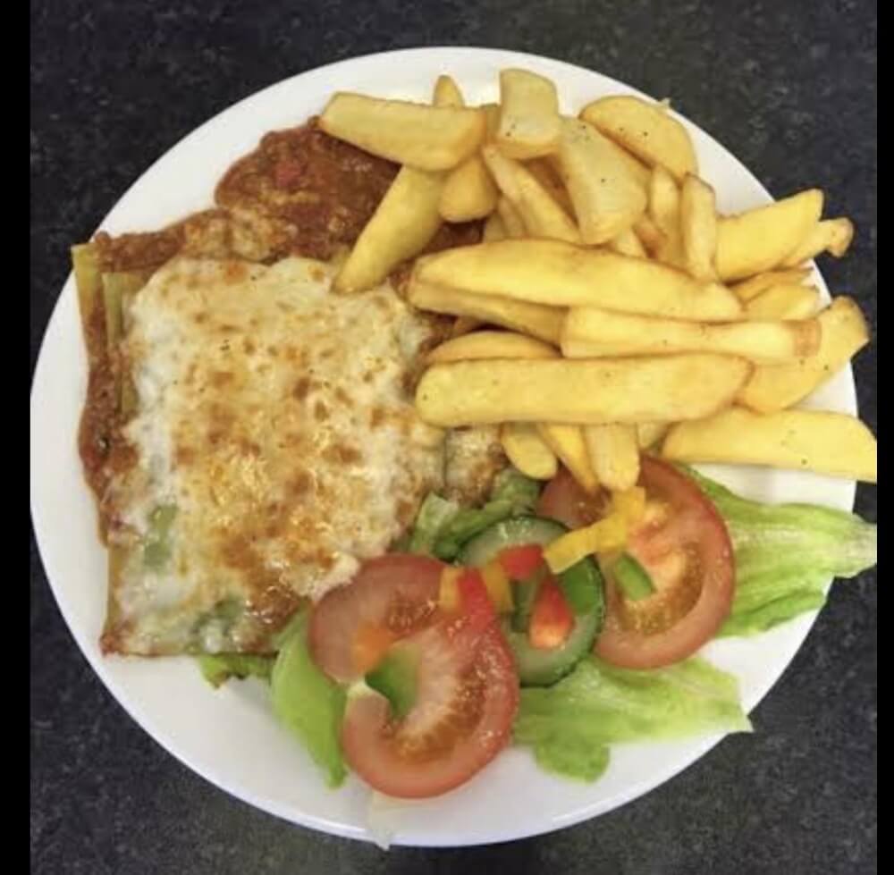 Delicious steak with lettuce, Carrot, beetroot, tomato, onions and cheese served with chips. Works add bacon, Egg and pineapple